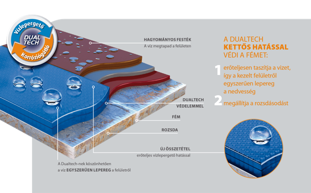 A DUALTECH technológia megvédi és tartósan széppé varázsolja kül- és beltéri fémtárgyaidat. Korróziógátló és vízlepergető tulajdonságának köszönhetően tökéletes védelmet biztosít a szélsőséges időjárás káros hatásaival szemben.